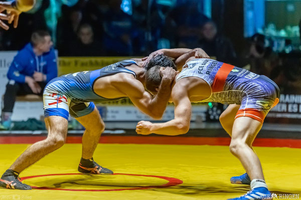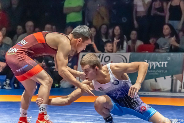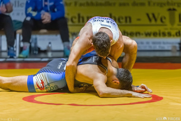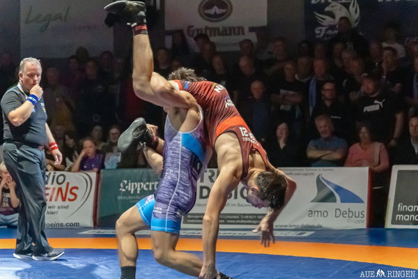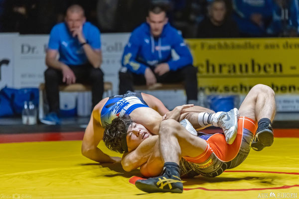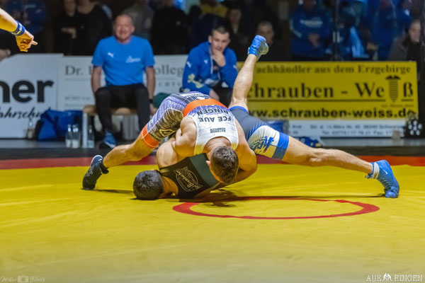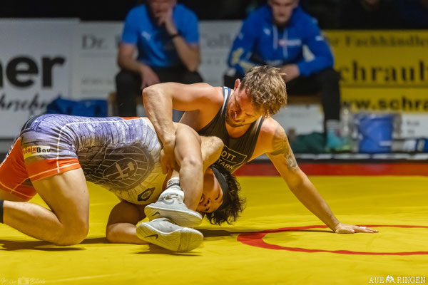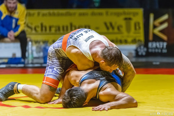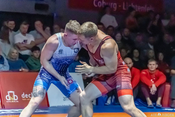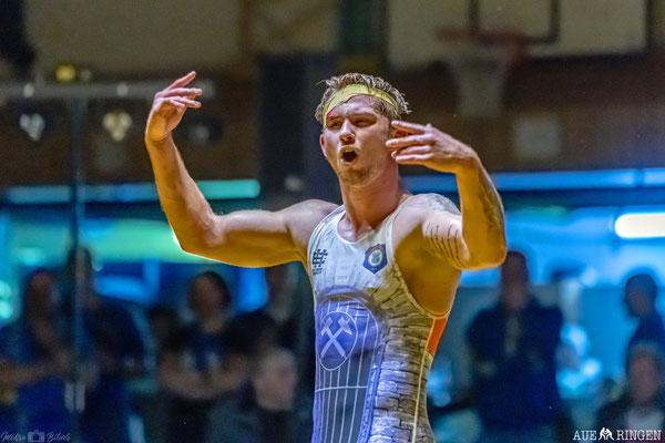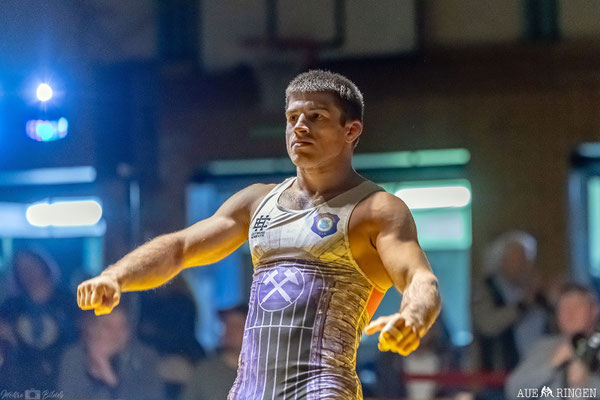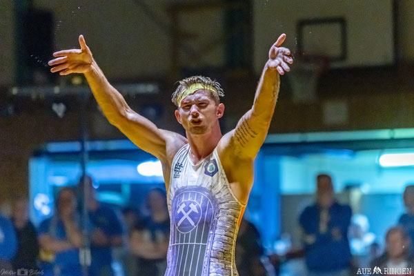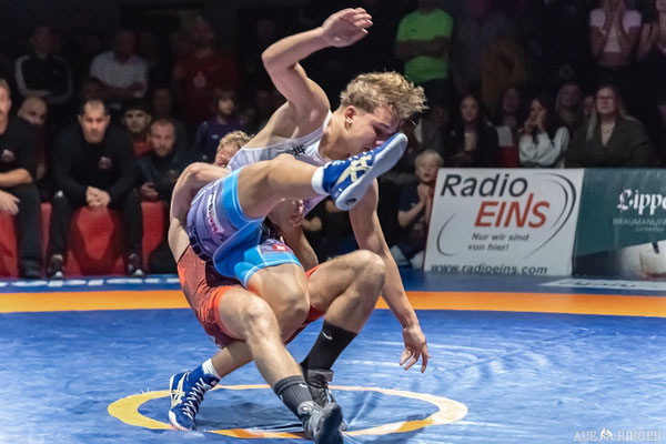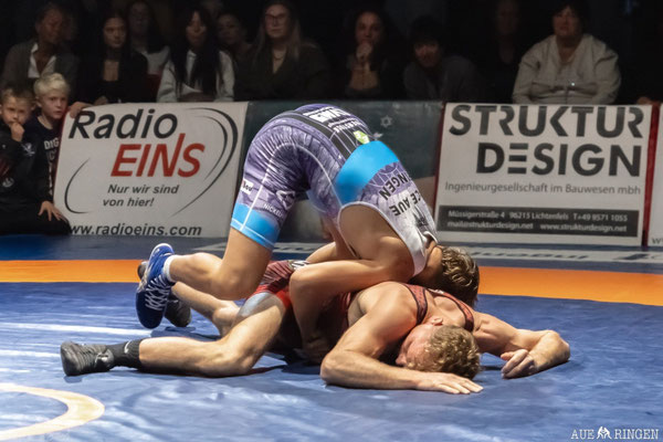 Mit 4 Sportlern aus dem eigenen Nachwuchs, 4 Neuverpflichtungen und zwei altbekannten Athleten ging Chefcoach Björn Schöniger in die Begegnung. Finn Weiß verlor gleich zu Beginn gegen den Kasachen Abzal Okenov technisch unterlegen. Emil Thiele, der kurzfristig für Connor Sammet ins Aufgebot rutschte, verlor ebenso gegen Giorgi Melia (5. Platz bei WM 2025) per TÜ. Willi Weiß als Jüngster im Team zeigte gegen den erfahrenen Ilir Sefaj einen starken Kampf und verlor erst nach 4:55 min per TÜ. Da auch Erik Skotarczak (Schulterniederlage gegen Aliaksandr Hushtyn) und Teetje Richter (gegen Ahmet Duman) ihre Kämpfe verloren, gingen die Auer mit einem 19:0 Rückstand in die Pause. In der zweiten Kampfhälfte drehten die Auer aber auf. Arkadiusz Kulynycz siegte gegen Hannes Wagner 3:1. Neuzugang Marco Stoll besiegte Raphael Titze mit 7:3. Auch "Neuveilchen" Vasile Diacon holte in seinem ersten Kampf für Aue Punkte. 10:3 besiegte er Daniel Sartakov, indem Vasile permanent den Gegner beschäftigte. Dann kam der erste Einsatz unseres Ringers aus Fernost. Ryoya Yamashita holte sich einen 16:0 Sieg gegen den namhaften Vadim Sacultan und sicherte seine ersten vier Mannschaftspunkte für die Auer Ringer. Im letzten Kampf gingen die Punkte wieder nach Lichtenfels. Max Becher musste sich dem gebürtigen Pausaer Max Schwabe geschlagen geben.
