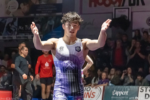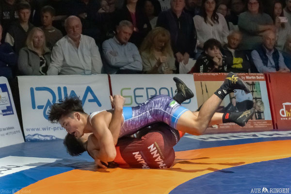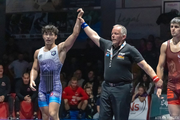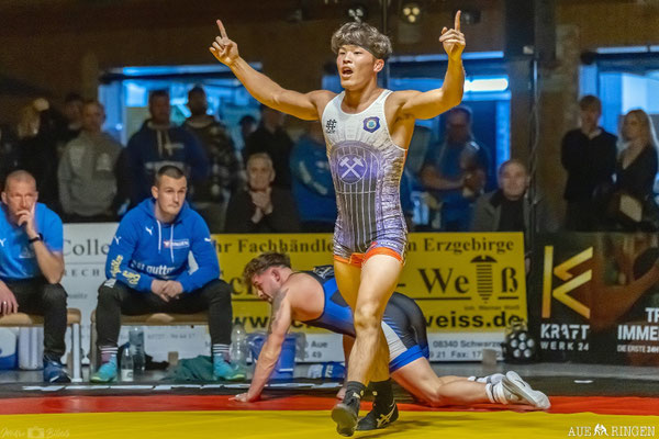 Vor der Pause kam noch der Kampf in der Klasse bis 71 kg im freien Stil. Und dieser sollte das Highlight des Abends werden. Unser Neuzugang Ryoyo Yamashita brannte ein Feuerwerk an Technik ab. Der junge Japaner war für seinen Gegner -und für manche Zuschauer- einfach zu schnell. Nach 1:52min konnte er mit dem Publikum gemeinsam seinen Überlegenheitssieg feiern. In der Pause war der japanische Neuzugang in aller Munde und gefragtes Fotoobjekt.