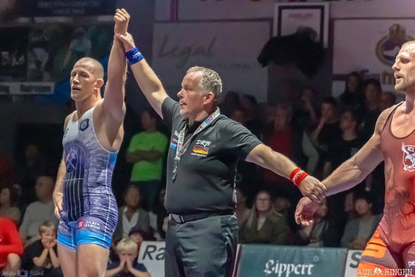 In der Gewichtsklasse bis 130 kg gab es die erste Überraschung des Abends. Emil Thiele konnte den Ukrainer Murazi Mchedlidze mit 3:2 in die Schranken weisen und sorgte das erste Mal für Jubel in der gut gefüllten Wettkampfhalle.